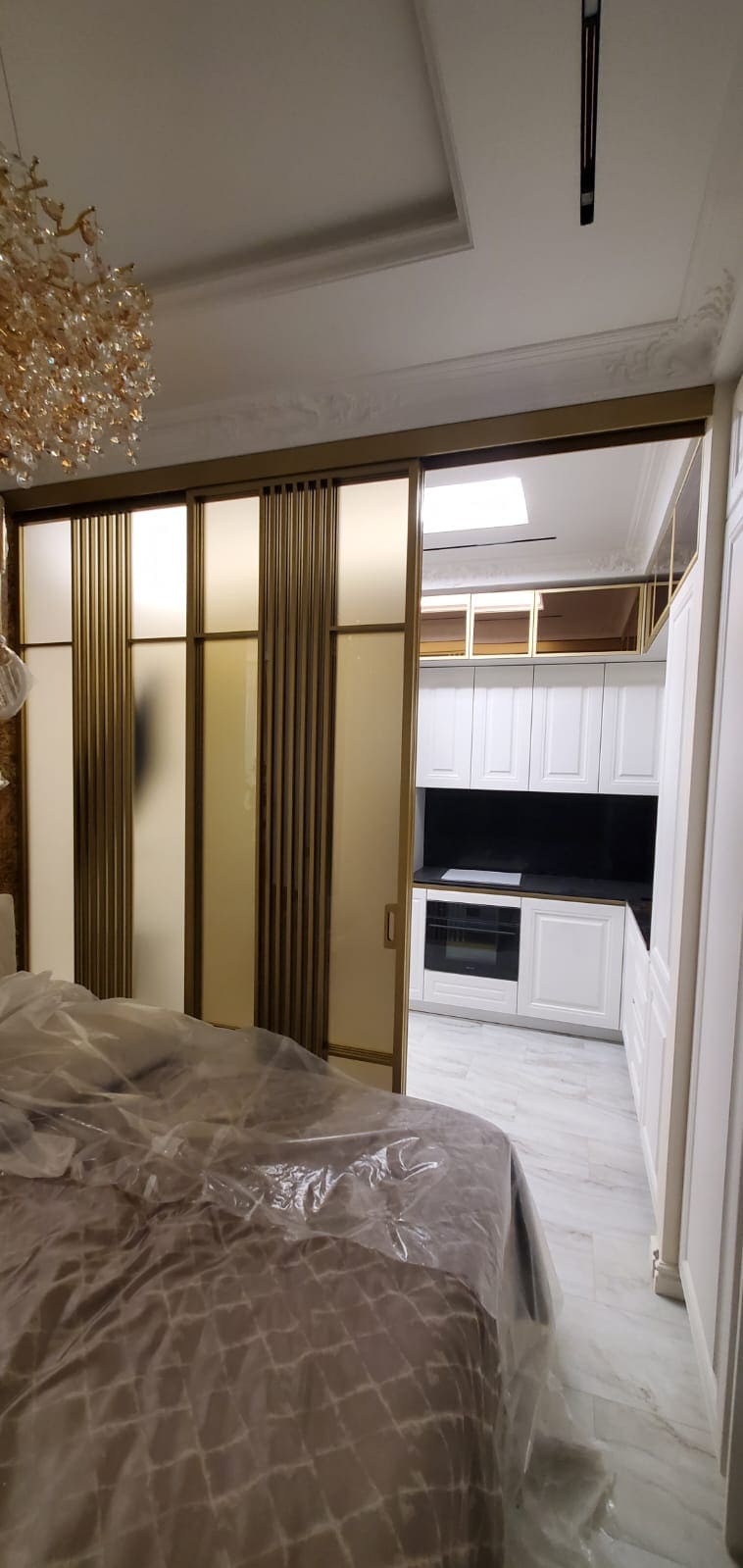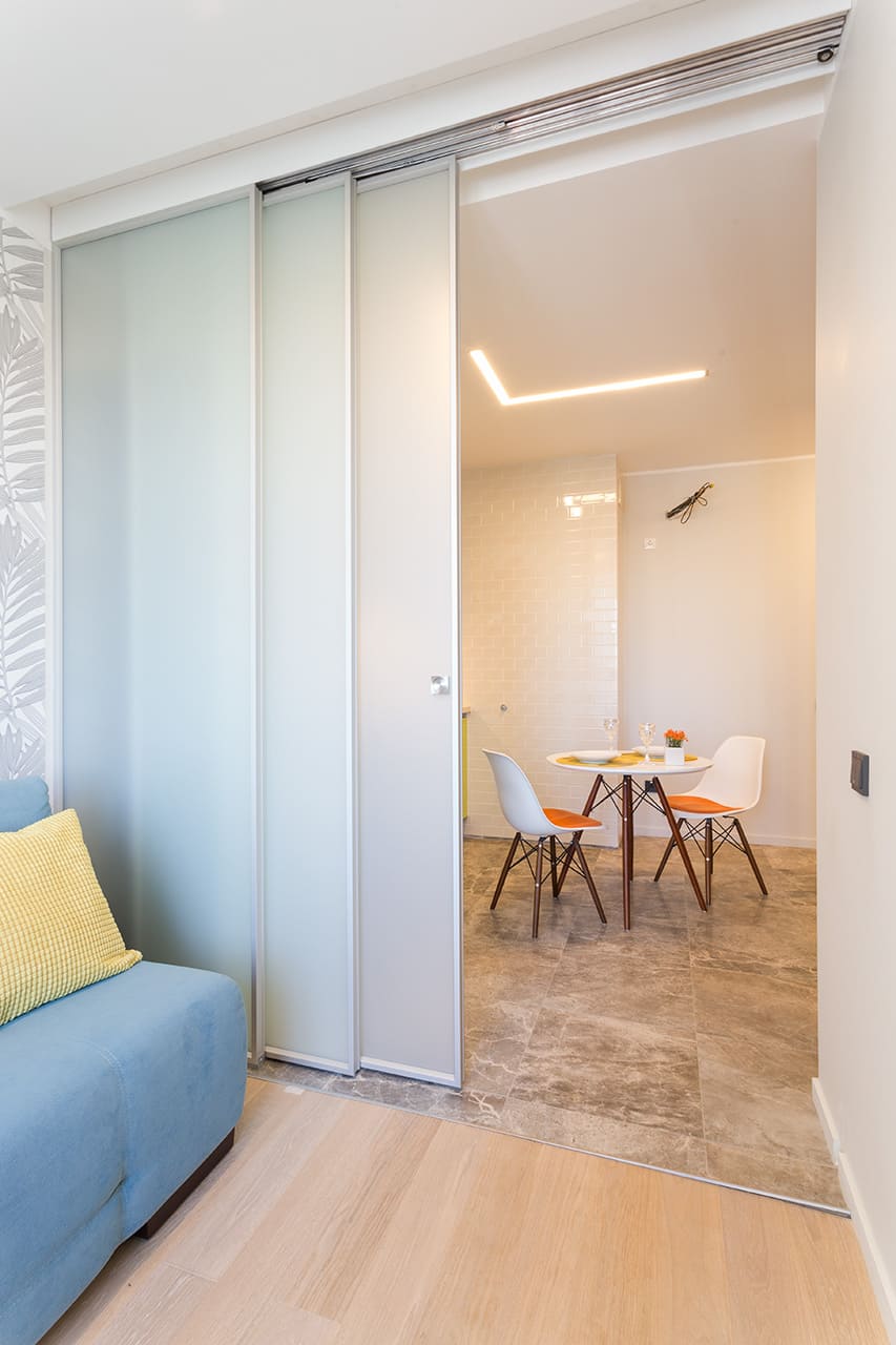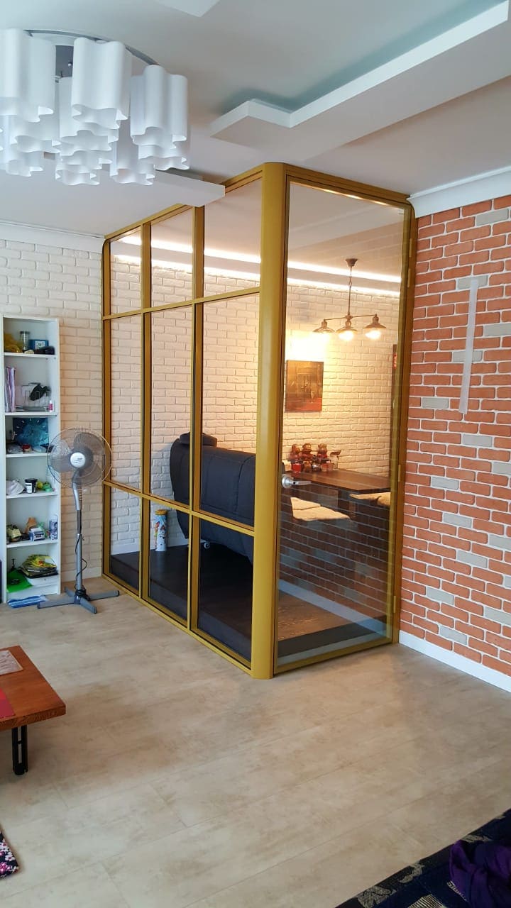 Norėdami savo mažoje studijoje atskirti miegamąją zoną nuo svetainės, užsisakėme iš vaikinų pertvarą. Pertvara yra stumdoma ir permatoma, todėl bute neužima vietos. Manome, kad sprendimas praktiškas, estetiškas ir gana palankus pinigų atžvilgiu! Esame 100 % patenkinti )
